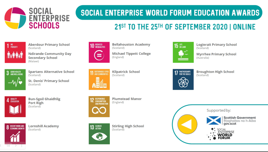 Last Autumn (2020) SEA ran an online education awards ceremony for the Social Enterprise World Forum to celebrate the efforts of young people contributing towards the SDGs through social enterprise, building their skills and confidence, and demonstrating what a positive asset they are to their communities. The Forum was attended by over 3,000 social entrepreneurs and change makers from over 50 countries around the world.