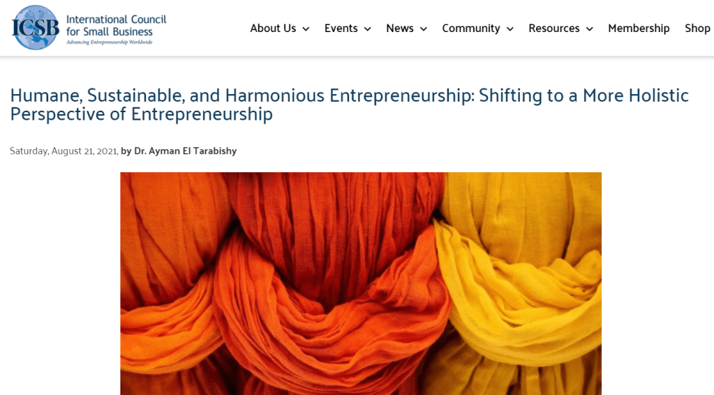 “Integrating different entrepreneurial sectors allows us to stand together, stronger and more capable than ever before” shares Dr Ayman El-Tarabishy (Executive Director of the International Council for Small Business) in the recently published article “Humane, Sustainable, and Harmonious Entrepreneurship: Shifting to a More Holistic Perspective of Entrepreneurship”.