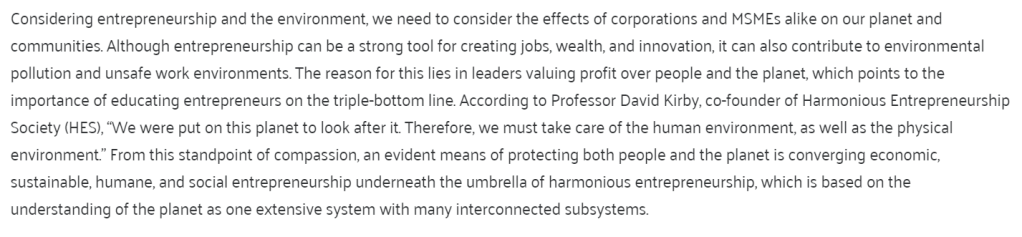 At the Harmonious Entrepreneurship Society, we firmly believe that entrepreneurship can significantly impact the Sustainability Challenge. Harmonious Entrepreneurship is indeed founded on the fact our planet is a system, and if entrepreneurship is to address the challenges facing us, it needs to adopt a systemic approach in which the traditional, individual entrepreneurial approaches are harmonised to produce a holistic solution that embraces Profit, People and Planet. Just as Professor Ayman El-Tarabishi and the International Council for Small Business have recognised in their post. We thank them for their signposting to our work.