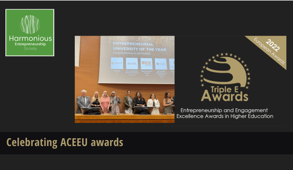 UWTSD winning such a prestigious Award (ACEEU) was a huge achievement, congratulations to all involved. As Professor David says in this piece, it takes a long time to initiative change but it is taking place. Now the real work starts as all those competing Universities across Europe will be watching UWTSD to see what is coming next. The UWTSD/Harmonious Entrepreneurship partnership could be the conduit to set the new paradigm for enterprise education in Higher Education.