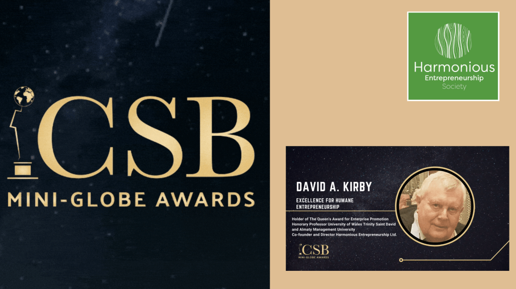 Pleased to share that at the annual ICSB Mini Globe Award Ceremony held on 16th January 2023 I was delighted, honoured and humbled to receive the Award for Excellence in Humane Entrepreneurship for the development and promotion of Harmonious Entrepreneurship. Apart from thanking the ICSB I would like to thank them for the way they are promoting sustainable entrepreneurship globally and for their support of our activities. My thanks particularly go, also, to my Harmonious Entrepreneurship Ltd co-founder, Felicity Healey-Benson. Without her, none of what we have achieved, in such a short period of time, would have been possible. Diolch yn fawr iawn. Felicity.