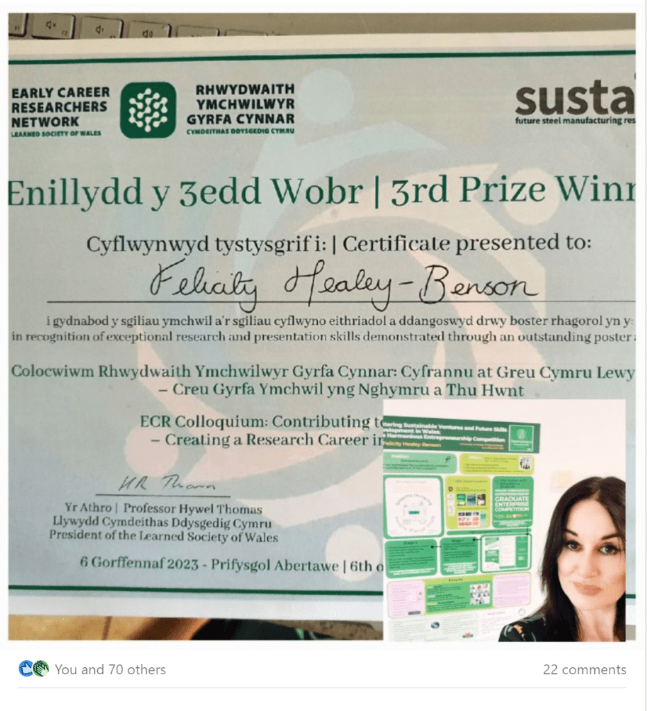 What a remarkable few months it has been for Felicity, which the Harmonious Entrepreneurship Society is delighted to celebrate. First she successfully defended her Doctoral thesis on 14th February, 2023, then she received her Doctoral Certificate, dated 5th May, her late father’s birthday, and on 11th July she finally graduated at a joyous ceremony held in the new Swansea Arena. In between, on 6th July, she was the third prize winner at the Learned Society of Wales prestigious Early Career Researchers Network Colloquium. This was for her exceptional research and presentation skills demonstrated by her poster presentation on Harmonious Entrepreneurship and its contribution to a prosperous Wales.