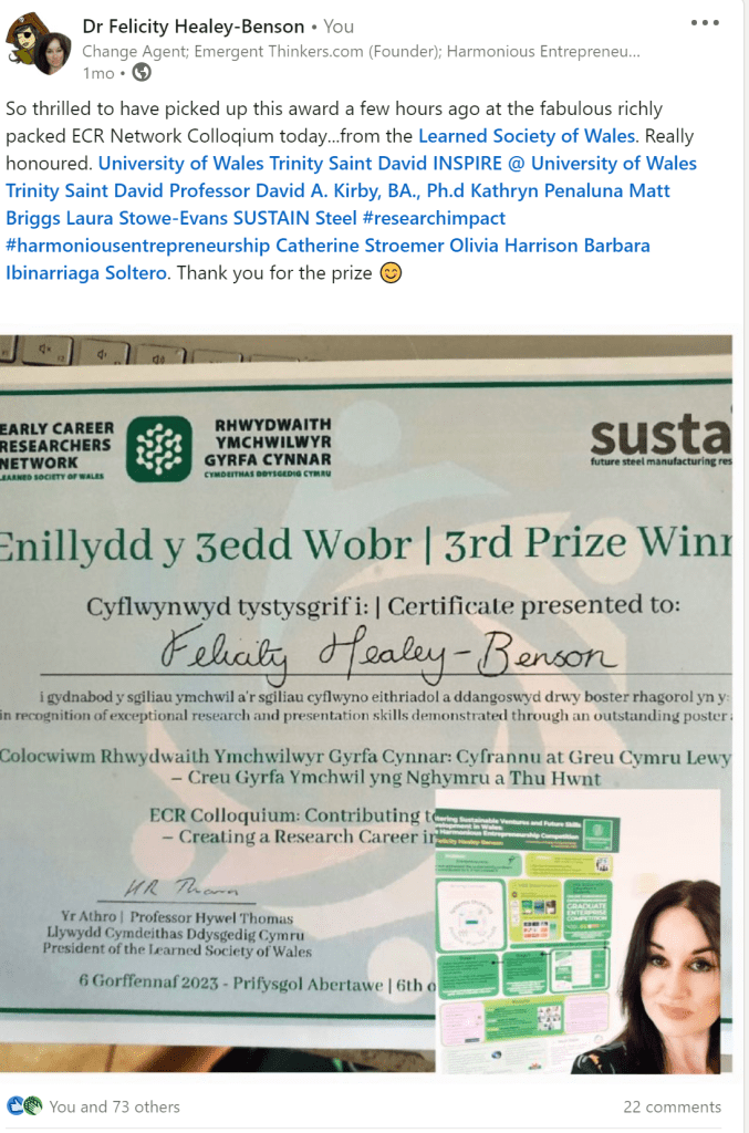 Wales has in place a series of policies and strategies to address the sustainability challenge and recognises the important role that education can play in ensuring that the needs of the present are met without compromising the ability of future generations to meet their own needs. Hence, it was heartening to see the Learned Society of Wales recently organising a network event for early-stage researchers that considered the contribution they make to the future prosperity of Wales. It was even more heartening to hear Felicity’s enthusiastic account of the day and to know that what we are doing in the Harmonious Entrepreneurship Society is seen as contributing to the future for a prosperous Wales that cares for both its environment and its people.