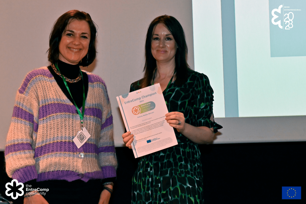 At the event, I was honoured to receive the EntreComp Champion Award from Dr Dana Puia Morel of the European Commission. This moment, overflowing with personal pride, was not just a recognition of my journey but a celebration of the entire Dafen School community—from our diligent students and staff to the supportive parents and extended community members. The presence of notable figures like Dr. Horst Heitz and Paul Rübig, President of SME Connect, along with other distinguished representatives from the European Commission, highlighted the significance of our collective endeavour within the expansive global EntreComp network. This accolade, recognising both individual and organisational champions of EntreComp, powerfully underscored the extensive reach and profound impact of our shared commitment to fostering entrepreneurial skills across Europe and beyond.